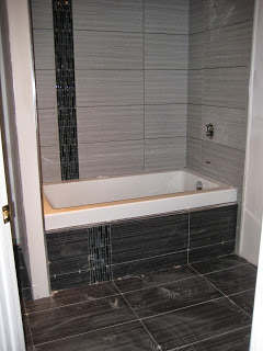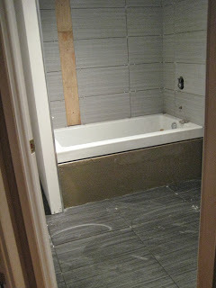 Day five is when things started getting awesome: tiles! As you can see, we picked dark grey tiles for the floor and a pale grey tile for the bathtub walls. The wood piece is there as a placeholder for the mosaic.