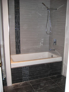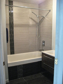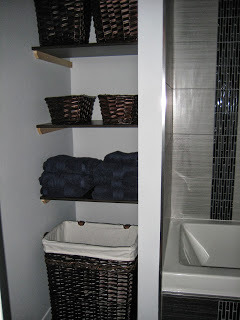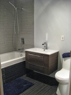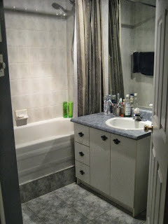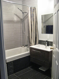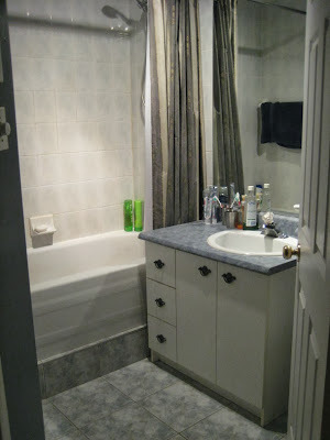 Much better, yes? The bathtub is finally comfortable, the mold is gone, the room feels much bigger, and there's more storage space than we know what to do with.