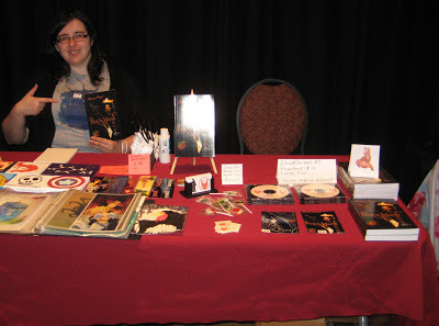 Since I had a spot in the artist alley, I spent most of the weekend sitting there and chatting with my friend Ju, who was sharing the table with me. Here's Ju helpfully holding up a copy of my book at our table. The art pieces are hers. (The dvds contain ebook copies.)