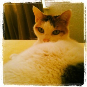 Elizabeth had a subtle beauty that crept up on you — a kind of beauty that I can only compare to, say, the Mad Men character played by the actress Elizabeth Moss. She was also both delicate and feisty. One of the few times she managed to slip outside, she took on a pit bull (that initial vet bill to repair a gash in her leg was a sign of things to come). But she also was very sensitive — it turned out that every time we moved to a new home, she stopped eating and developed a liver condition called hepatic lipidosis– “fatty liver disease.” Then there were the times she went on a hunger strike for reasons I could only guess, like because she’d busted me feeding a stray cat at the back door, and the times when I couldn’t even hazard a guess as to what had triggered it. At least three times she had to have surgery to have a tube put in her stomach so I could feed her by syringe for months on end until she recovered. Other times I caught it early enough that just a few days of supplemental force feeding could turn her around. It was as if whenever I got distracted, she went on a hunger strike, just to test me. Over the course of her life, I probably spent at least $10,000 dollars on tests and surgery. Over and over, I’d bring her from the brink, nursing her back, feeding her by hand, for months and months. Needless to say, this very intimate care only deepened our bond.