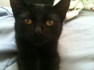 I’m not yet ready to fall in love with another cat, but I am willing to bring other cats into my life, if only fleetingly. This past weekend, I went to the Humane Society to see if there were any cats that needed fostering. I watched as one lovely young couple clearly had a love-at-first-sight experience with an adorable three-month-old black kitten. “You have to take her! She’s clearly meant to be yours,” I told them. Luca and Isabella both shook their heads sadly. No, they couldn’t take her because they wouldn’t be able to take a cat home for another few weeks, and it was clear that this charismatic kitty would long gone by then. But a solution was immediately clear to me: Isabella and Luca should go ahead and adopt her, and she’d live with me until they moved into their apartment in a few weeks time.