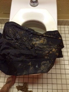 When I was sure that I had finished, I took my pants off to start the cleaning process. I was not prepared for the mess that I saw. From top to bottom, my entire back of my pants were wet and saturated in a brown substance."Well, at least the front was in tack," was all I could think. I started my regular process, of trying to clean my pants with damp toilet paper, but the poop was embedded into the legs of the pants. I knew that I had to dip them carefully in the toilet to clean them. Carefully, because I couldn't get the front wet. I still needed to get home by way of taxi. But dipping the pants in toilet was not doing the trick. This poop was grainy and not moving. So I dipped some more and all that did was make them wet and more wet and the poop was still barley moving.