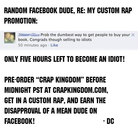 If you haven’t bought the book yet, I would love it if you would, and I’d love it even more if you’d do it now, before you forget, over at http://crapkingdom.com, which has links to both Amazon or Powell’s Books if you’d rather go the independent route.