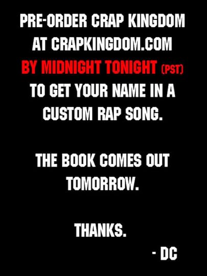 Please share it if you enjoy it and if you haven’t yet, please pre-order at http://crapkingdom.com. Do if before the book comes out on Thursday and I’ll write your name into a custom rap song. True story.