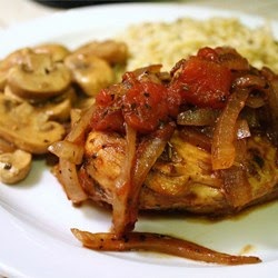 35 mins DirectionsSeason both sides of chicken breasts with garlic salt and pepper.Heat olive oil in a skillet over medium heat; cook seasoned chicken breasts until chicken is browned, 3 to 4 minutes per side. Add onion; cook and stir until onion is browned, 3 to 4 minutes.Pour diced tomatoes and balsamic vinegar over chicken; season with basil, oregano, rosemary and thyme. Simmer until chicken is no longer pink and the juices run clear, about 15 minutes. An instant-read thermometer inserted into the center should read at least 165 degrees F (74 degrees C).