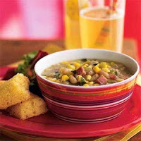 1 cup sliced green onions 3/4 cup chopped cooked ham (about 4 ounces) 3 cups fresh corn kernels (about 5 ears) 1/2 teaspoon salt 2 (15-ounce) cans navy beans, rinsed and drained 2 (14-ounce) cans fat-free, less-sodium chicken broth 2 (4.5-ounce) cans chopped green chiles, undrained PreparationHeat canola oil in a Dutch oven over medium heat. Add onions and ham, and cook 3 minutes, stirring frequently. Stir in corn and remaining ingredients. Bring to a boil; reduce heat, and simmer 5 minutes or until thoroughly heated.