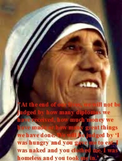 "At the end of our lives, we will not be judged by how many diplomas we have received, how much money we have made or how many great things we have done. We will be judged by ‘I was hungry and you gave me to eat. I was naked and you clothed me. I was homeless and you took me in.’" - Mother Teresa.