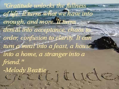 "Gratitude unlocks the fullness of life. It turns what we have into enough, and more. It turns denial into acceptance, chaos to order, confusion to clarity. It can turn a meal into a feast, a house into a home, a stranger into a friend." - Melody Beattie