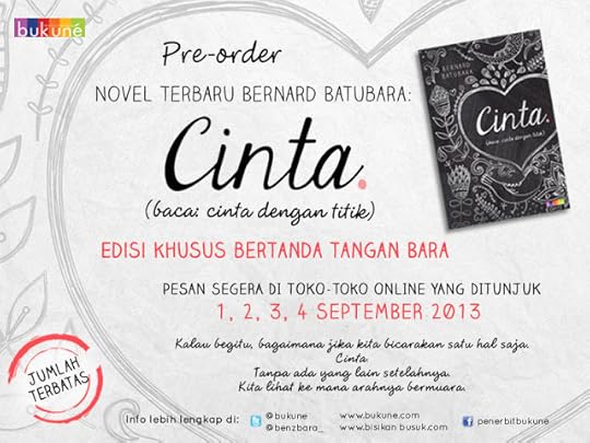 Novel terbaru saya, Cinta. [baca: cinta dengan titik] (Bukune, 2013) telah dapat dipesan lewat pre-order di beberapa toko buku online. Pre-order Cinta. dimulai tanggal 1 - 4 September 2013, hanya selama empat hari. Selama empat hari tersebut, pembaca tercinta dapat memesan Cinta. Pengiriman buku untuk para pembaca yang memesan Cinta. lewat pre-order dilakukan pada tanggal 7 September, sehingga para pembaca bisa mendapatkan novel tersebut lebih awal dari toko buku offline. ...
