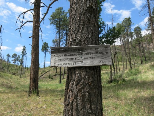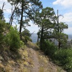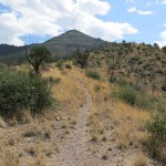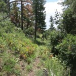 I’d forgotten to add this trail to my list. It climbs out of a narrow canyon to a ridge that it follows to the 9,000 foot crest, where after five and a half miles it connects with a two-and-a-half mile southbound trail to the 9,800 foot peak I pass on one of my old favorite hikes. Of course, it crosses the burn scar of our 2012 mega-wildfire, but the first three miles had been cleared last fall, and the rest was scheduled to be cleared this fall. So maybe there were enough clues left for me to be able to puzzle out. If I could reach that southern peak – unlikely in this heat – it would be a 16 mile round-trip with 5,700 feet of elevation gain.