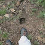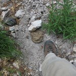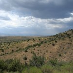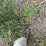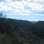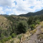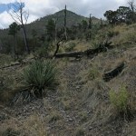 The storm was moving away by the time I left my little ledge and began retracing my route. After I traversed the level area below the ridge and rejoined the old trail, I found it easier to follow it and cattle trails all the way down the overgrown burn scar of the upper canyon. Easier to follow, but painful – an entire day of sidehilling in loose dirt in my more flexible dry-weather boots had been really hard on my problem foot, and I vowed yet again to add foot exercises to my weekly regimen.