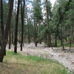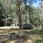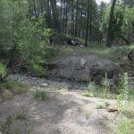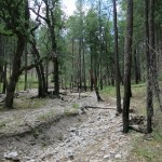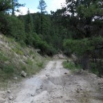 The road wound down through the forest onto the floodplain of an intermittent stream, where it got sandy and passed the ruins of a cabin and corral. Shortly after that, I came to a five-foot-deep sheer washout. Nobody was driving past that anymore.