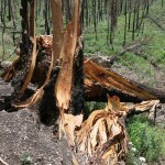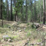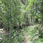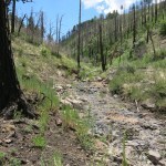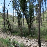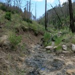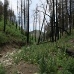The cattle trail descended to the creek, which was flowing over bedrock, and the intact forest ended. From here on it was all burn scar and dense regrowth, much of it thorny locust.