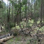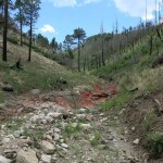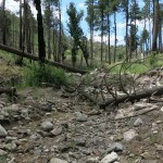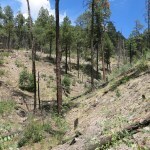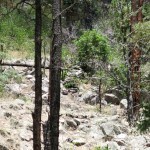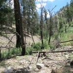 This narrow side canyon had mostly intact forest in its lower part, but it had experienced serious flooding and erosion. Instead of a trail, I found remnants of an old road, most of which had been washed out, so that my hike alternated between stretches of climbing over and around deadfall on a gentle slope, and picking my way across debris flows and logjams in the creekbed. I found signs of cattle but they looked to be about a decade old. The creek was almost completely dry, but flies continued to swarm me.