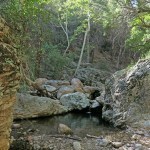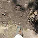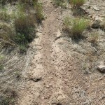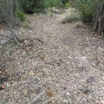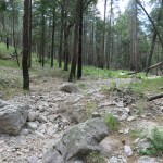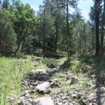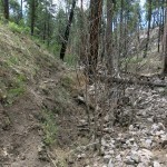 The left slope was very steep and eroded, so I started bushwhacking up the right slope, where I soon found what appeared to be an old cattle trail, blocked often by deadfall. This trail, deeply pockmarked in loose dirt, climbed high above the creekbed, which was now flowing intermittently. In places, it even looked like the remains of a human trail, but I hadn’t seen human footprints anywhere all day, not even on the road.