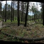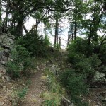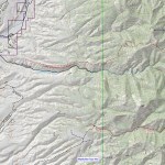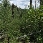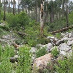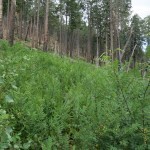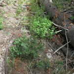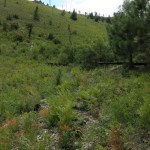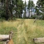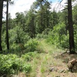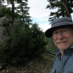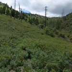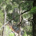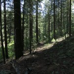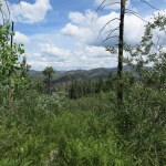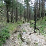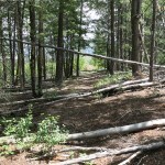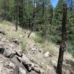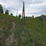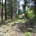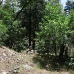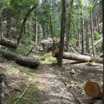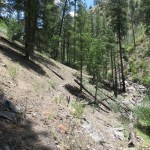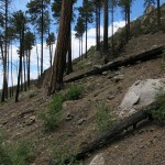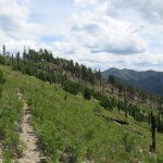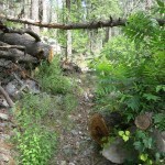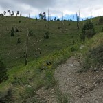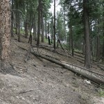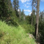 I could barely discern the trail leaving the cabin for the peak. There was no sign, but there was a vague disturbance in the annual ground cover, heading up in the direction of the ruined outhouse. When I followed that, I noticed a branch veering off into the forest. No one but animals had used this trail in the current growing season – it was almost completely overgrown and blocked repeatedly by deadfall. But it had been used heavily by firefighters last summer, so there was enough tread left under the vegetation that I could read it by going slow.