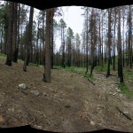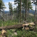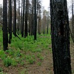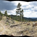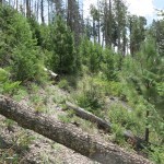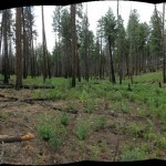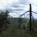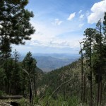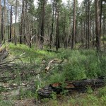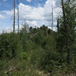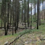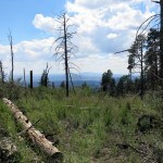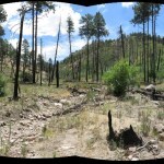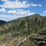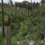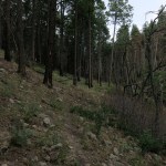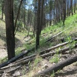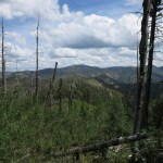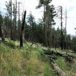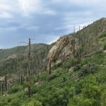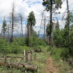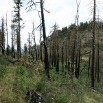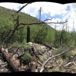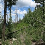 I crossed the 9,500′ saddle on the shoulder of the peak and headed down the trail on the back side, through the burn scar dense with regrowth of aspen and locust. The wind was coming from the south, and when I reached the first small stand of intact forest a big limb snapped off and fell a couple yards to my right. I stopped, then figured I’d be safer in the midst of the forest, so I kept going. But then another limb snapped off and fell a few yards to my left. I was pretty sure the wind here was exceeding 50 mph, so I was paying a lot of attention to the canopy.