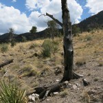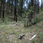 It was slow going, and I soon gave up any hope of the 13-mile loop. I was looking for the first milestone, where the canyon would veer left and another “trail” would head straight over a low saddle. On the way, the slope at my right became a burn scar. I finally reached the left turn in the canyon, and saw the low saddle ahead, but I was bushwhacking at this point – I could see no trails anywhere. Then, squinting through charred snags in the canyon bottom, I thought I noticed a wooden sign on a dead tree trunk.