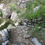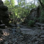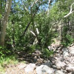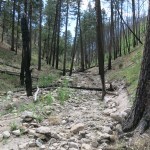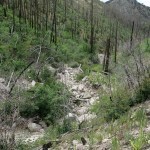 After scrambling over a long debris field and rejoining another section of the old road, I came to the junction of the two creeks. What was left of the old road continued up the left branch, so I began searching for the trail that led up the right branch. I’d read that there was a trail sign here, but there was nothing remaining of it or the trail – apparently victims of catastrophic post-fire flooding.