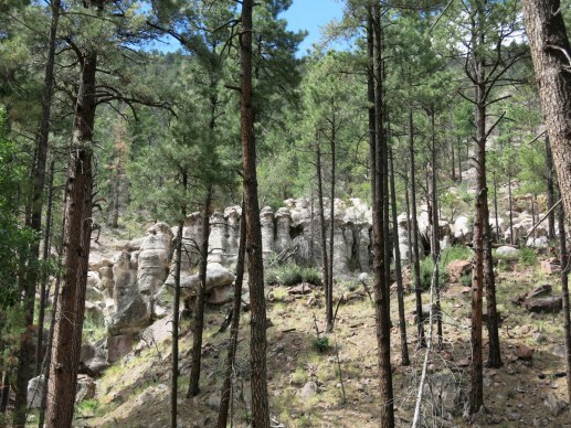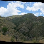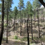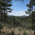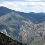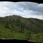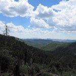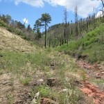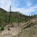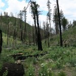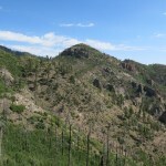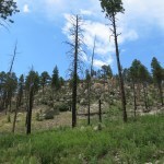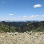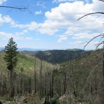 After about two-thirds of a mile with that eastward view, the road crossed to the other side, where I could view that badly burned canyon I’d seen on my way up. The stands of aspen and fir that had been killed in the fire created bands of black and tan on the slopes that alternated with white outcrops of volcanic conglomerate and green regrowth of locust and Gambel oak.