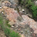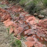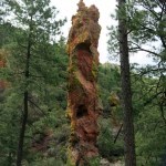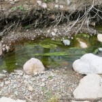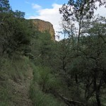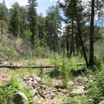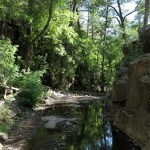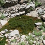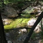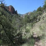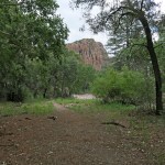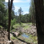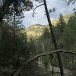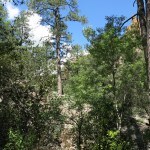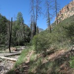 One or more bears had preceded me on the trail this morning, leaving scat all the way up. The first stretch is a steady four-mile ramble at a shallow grade, under red cliffs and spires, through riparian forest dominated by sycamore, cypress, ponderosa pine, and oak. The creek was running intermittently, but often choked with algae. I saw no human tracks anywhere – presumably the heat’s been keeping hikers away.