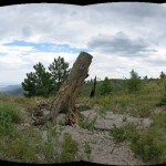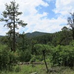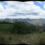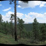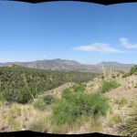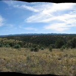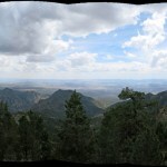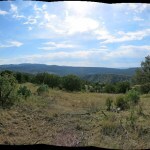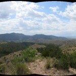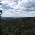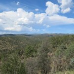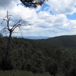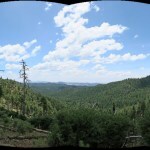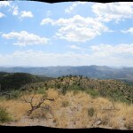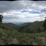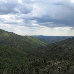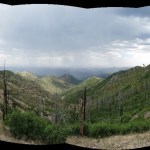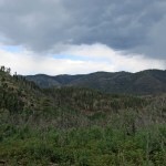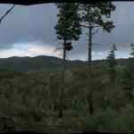 After leaving the cabin and rejoining the crest road through the burn scar, I came upon two hawks, soaring together and apart, hovering, diving and briefly grappling mid-air. My views of the landscape were an ever-changing pageant of monsoon weather.