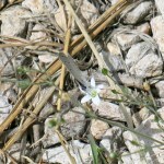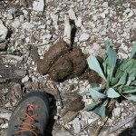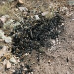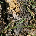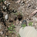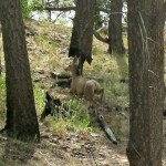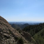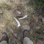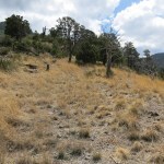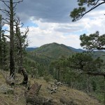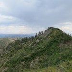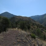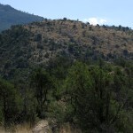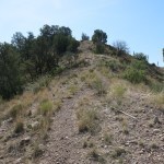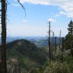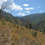 Past the lower peak, the trail traversed a steep slope that had been badly eroded and colonized by thorny locust. Here, I flushed a small hawk, not much more than a foot long, probably a Cooper’s or sharp-shinned. This was the slowest part of my hike, and the hardest to follow. But again, the trail crossed watersheds, and I was facing east again on an even steeper slope, where the trail seemed to be maintained by deer and elk. I’d seen no evidence of humans on this trail, probably not since the summer 2002 wildfire.