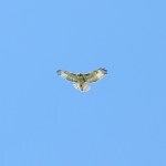 But about halfway down I came upon a pile of really fresh bear scat, and started making a lot more noise. Then I saw the first hawk, circling around the little peak above my destination saddle, and heard it screech. Soon it was joined by another, and they poised together in the face of the wind and were joined by a third. The wind was fierce but they kept trying to hold a formation together, right over my head. They stuck around for ten or fifteen minutes before drifting away together.