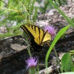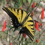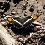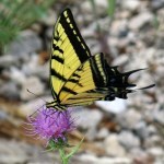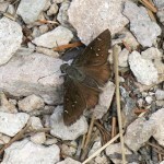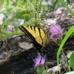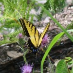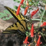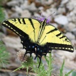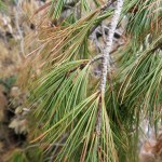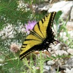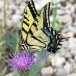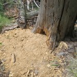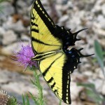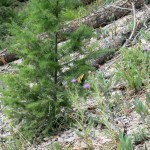 When I finally reached the long switchbacks down from the crest and got some relief from the wind, I was lucky to encounter a solitary swallowtail butterfly. And I stopped to examine a small pine that had blown down across the trail recently enough that some needles were green. I figured it was the same species as the trees I’d seen on the crest – probably a Southwestern White Pine, which must be fairly common here if you know to look for them.