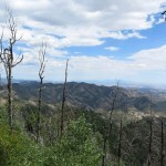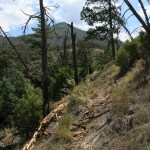 The last two-and-a-half miles are very seldom used, running just below the crest through wildfire burn scar and remnant forest on a steep and rocky slope. I heard whooping and hollering behind me, and the grinding of tires on gravel, and was glad the mountain bikers were sticking to the fire road.