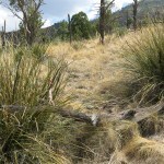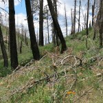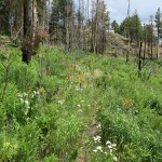 This restored trail had already been colonized by annuals, responding to moisture that remained in the soil from last winter. But I quickly learned to just ignore the annuals, striding through them as if they didn’t exist. I could see the narrow drainage above this burn scar, where a band of forest had escaped the fire. That was my next destination – I’d failed to bring a map, but assumed it led straight to the crest.