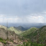 It had taken me 5-1/2 hours to go seven miles, climbing almost 4,000 feet, in tropical humidity. I’d felt a few sprinkles on the last switchback, but that would be it for the day. I was rewarded with a view into a new watershed, but this saddle wasn’t a place to linger. And I had to make much better time on the way back, to reach the cafe, burrito and beer before 6 pm closing.
