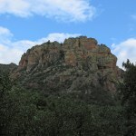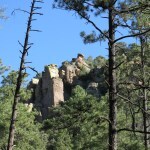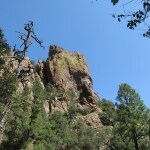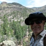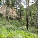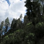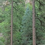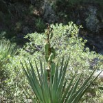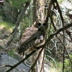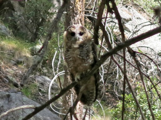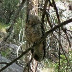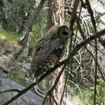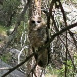 Steller’s jays had been harrassing me all day, but partway down the trail in the canyon bottom I sensed something rising in the corner of my eye, and noticed a shadowy form settling on a low branch, only 30-40 feet away. It was an owl! A small one, only about 12-14 inches head to tail, but when I got home and looked it up, I found it was almost certainly a rare Mexican Spotted Owl, probably a young one. It just sat there and watched me, obviously curious, until I finally had to go.