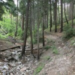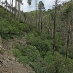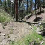 I had to at least confirm that the upper trail was accessible. On my previous attempt, I’d gotten lost in a deeply eroded ravine choked with deadfall and regrowth. The ravine remained a nasty place, but big cairns on each side showed where to cross, and clear tread continued on the opposite side.