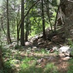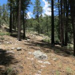 Moving slower than usual due to the heat, I finally reached the junction where the big side canyon comes in from the west. Beyond here, the trail becomes very rocky and very steep, climbing continuously at an average grade of 21% for the next three miles, but it also enters dense mixed-conifer forest that provides more shade. Scattered clouds were forming so I was hopeful for cooling temps.