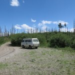 I did bash the undercarriage pretty good in one spot, but the payoff was the views. Approaching the crest, I was facing the highest points in the range across a wide canyon that had been burned to a moonscape. I was looking for a saddle with a surviving stand of conifers where I could park in the shade, and I finally found one, at the site of a SNOTEL – a snow telemetry site maintained by the National Weather Service.
