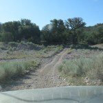 About 8 miles up the gently rolling mesa, the road begins traversing steeply down into the narrow canyon on its right, and here’s where the drive became really exciting. It’s a narrow high-clearance section over jagged bedrock – with a virtually sheer drop-off, hundreds of feet to the canyon bottom, at right – and the farther down I went, the more worried I was about my little truck being able to climb back out of it. Finally I reached the fork that led down to the creek, and a hundred feet down that I came to a steep section of white clay with deep erosional ruts I knew the truck couldn’t handle. But when I tried to back up the shallower slope to the landing at the fork, I immediately lost traction – the driving wheels are in the back while most of the weight is in the front.