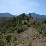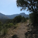 The approach is on a sporadically maintained primitive forest road up a narrow canyon. There were two other vehicles at the trailhead, but the only track I found on the road, and on the upper trail, was from a single mountain bike. The upper trail is so steep and rocky I assumed the biker took the gravel fire road to the crest from the opposite side, and rode down this canyon segment.