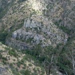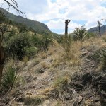 I came to another stopping point, where a big gully came down from the right, with a very steep and rocky slope on the opposite side and impassable thicket on my side. I was out of time, but studying the opposite slope closely, I thought I could see a couple of cairns way up there. I zoomed in with the camera so I could confirm them later.