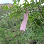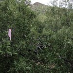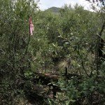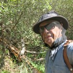 A second cairn above this one led me around a rocky narrows in the next drainage. I even found an old, sun-bleached ribbon tied to a burned snag. This whole hike was like successfully solving a puzzle, using familiar clues in an unfamiliar landscape. I’d wasted a lot of time on unsuccessful forays, but if I ever wanted to come back, I now knew enough to avoid those.