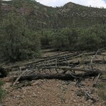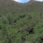 Rain clouds were massing over the head of the canyon as I picked my way up the creekbed, looking for more old cattle trails I could use to bypass debris piles and logjams. I often found one that would then disappear in a thicket of thorns or a mass of blowdown, but the deeply eroded creekbed had become impassable with flood debris and the right bank was too steep, so I had to keep fighting my way up the slightly more accessible left bank.