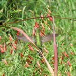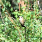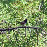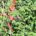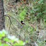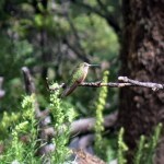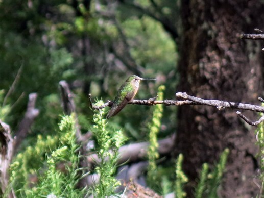 The habitat along most of this trail is lush even in a drought, but we’d gotten enough rain recently that wildlife was really thriving. Heading down though dense regrowth past the shoulder of the 9,000 foot summit, I noticed a hummingbird working the flowers ahead and froze where I was. The bird also stopped, to perch on a low branch beside the trail. I waited several minutes, then slowly moved a couple yards closer and froze again. I kept moving closer in stages like this until I was literally only a yard away, and the hummingbird – probably a female broad-tailed – hung in there, staring back at me with what appeared to be curiosity.