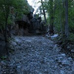 Eventually, after pushing through an especially nasty thicket of locust, I came upon what appeared to be a remnant of the old hiking trail. Now it was getting really dark, I heard thunder to the north, and before long it began raining. The old trail was often interrupted by erosion, deadfall, or blowdown, but it was still much better than fighting through thorns, and although thunder continued, the rain slackened by the time I reached a big level area at the head of the canyon.