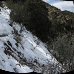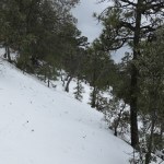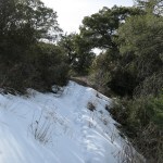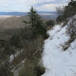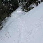 That’s where conditions got trickier. There were still occasional dry patches, but I was now above 7,000′, and the snow was up to six inches deep. And before long, I reached a narrow spot where one of the hikers preceding me had slipped off the trail and gone straight down the steep slope below. They’d slid at least fifteen feet, and maybe much more – I couldn’t tell with bushes blocking the view. The slope itself drops continuously two or three hundred feet into a ravine, with only spindly shrubs to break your slide – pretty scary!