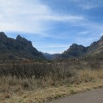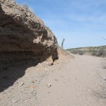 The cairns had ended and I was left with only my routefinding skills. And past the big canyon, trail conditions deteriorated further, with both thorny catclaw and mesquite often blocking my way. With no hope of reaching the pictograph site, but with a little time still remaining before I had to turn back, I forged ahead as best I could. The rock “bluffs” above on my right were getting taller and more spectacular.