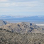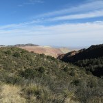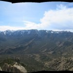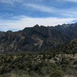 1,200′ up, I rounded the shoulder into the broad hollow of the north slope, a complex circling wall of layered red rimrock cliffs and towering spires, bisected by a precipitous ravine. Whereas my view on the first segment had been eastward past the range’s gateway, I now had a view across the northwest ridges of the range, all the way to the snow-draped crest of another range I’d last climbed in December, 70 miles away in the clear air.
