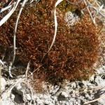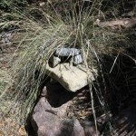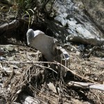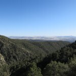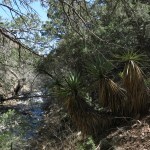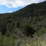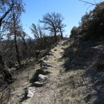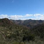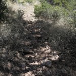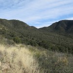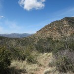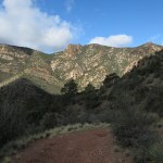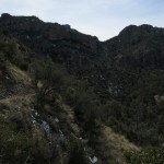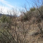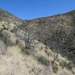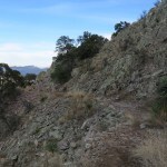 Unfortunately, the trail seemed to end at the creek. The only clue was an old sign pointing downstream to a spring – apparently the creek is normally dry. I followed that to where it ended at the bank of the creek. I crossed and saw a faint opening in the dense vegetation ahead, and shortly came to a tiny clearing where a barely discernable track switchbacked up the dark slope through the trees. Emerging from the riparian canopy, I found myself in what looked like a very steep, rock-filled erosional gully, but I kept climbing, and soon emerged on the familiar, overgrown, rocky, almost completely hidden single-track. A cold wind again threatened to take my hat, and I faced more rollercoaster ridges and steep climbs ahead.