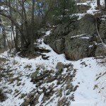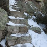 But today the lower steps were packed with slippery snow, so I made use of every available handhold – the brush and boulders at my left, the wet but snow-free edges of the steps above – and basically crawled up on all fours, trying not to think about the coming descent.