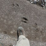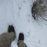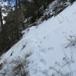 It was a good warning for me to proceed with utmost caution. But their tracks resumed past the narrow spot – I figured they must be young people who wouldn’t let a fall scare them. And whereas their tracks showed that they were hiking in sneakers or cheap lightweight boots, I was wearing my serious winter boots, with maximum traction.