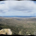 Summiting the stairs and stepping into the concrete enclosure, with its 360 degree view across the entire northern range, is one of the most dramatic moments imaginable. And as I was taking it in, and starting to take pictures, I heard a whoop from a neighboring peak, about 300 yards behind me to the east. It was the other hikers. I could make out a tall young man, but his partner was sitting behind a shrub. I waved back, and savored the views for about ten minutes, before firmly grabbing the handrail and stepping slowly down the vertiginous stairs, one at a time, nothing but a pipe railing between me and a 2,500′ vertical drop on my right. My time was getting short and I’d have to hurry down the dry stretches of trail.